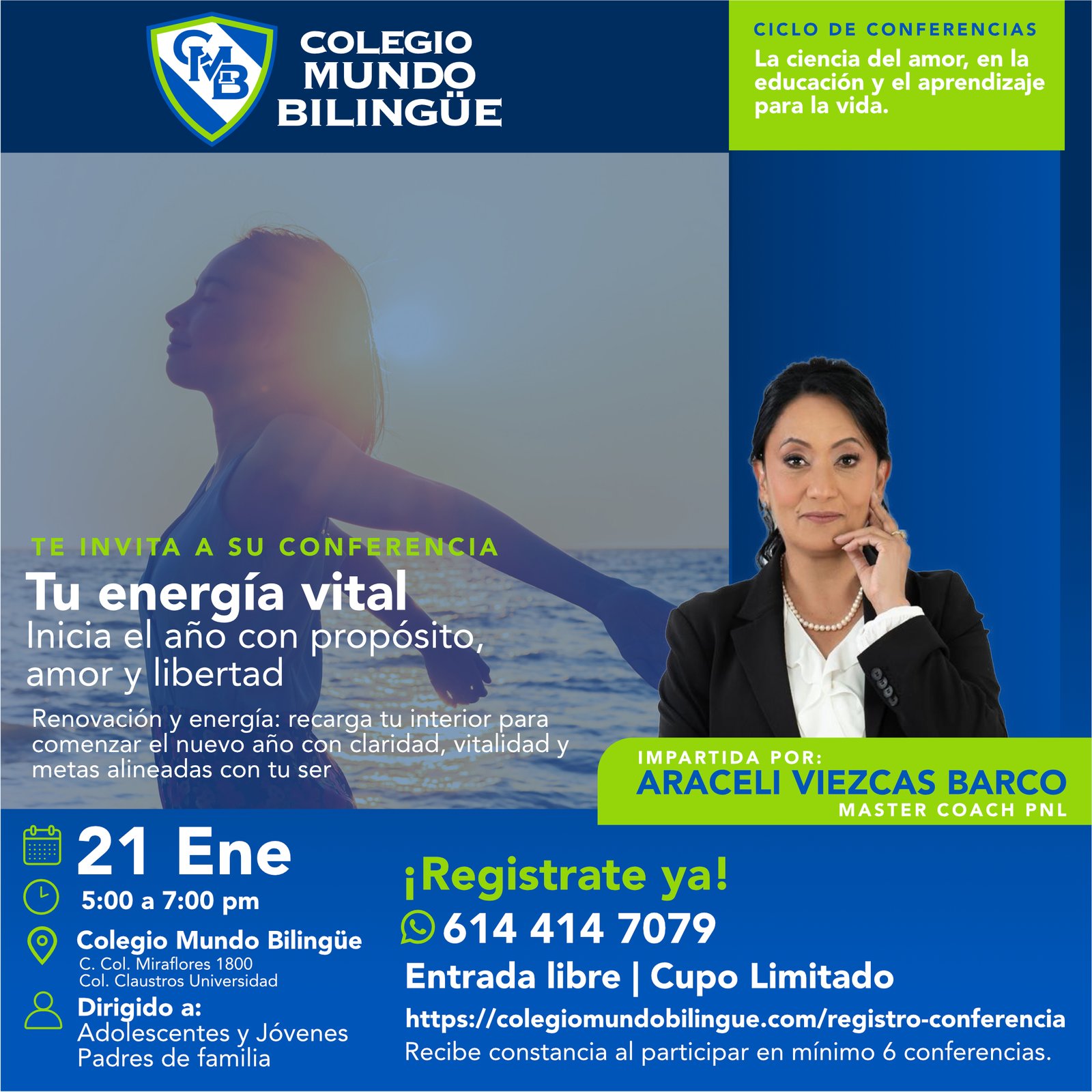 Nuestro Ciclo de Conferencias, esta diseñadas para padres de familia y público general, que buscan herramientas reales, apoyadas en la neurociencia para lograr un mayor crecimiento del ser. La Master Coach Araceli Viezcas Barco es la experta ideal para acompañarlos en este ciclo.